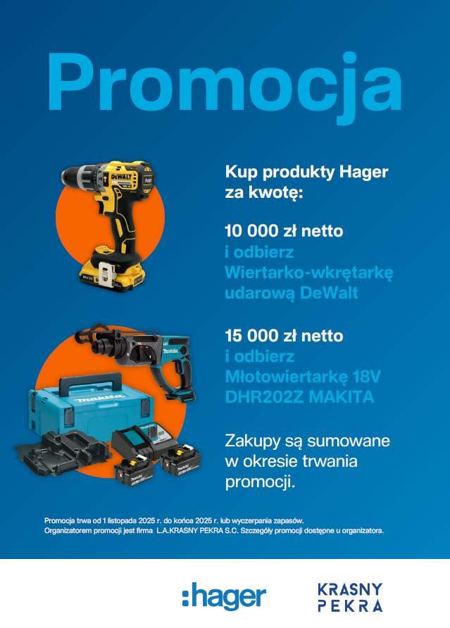 1. PROMOCJA !! 👍👍 Kupuj dowolne produkty firmy Hager w okresie od 01.11.2025 do 31.12.2025, a jeśli suma zakupów wyniesie 10 000 lub 15 000 PLN netto otrzymasz wartościowe elektronarzędzie 🤝.
